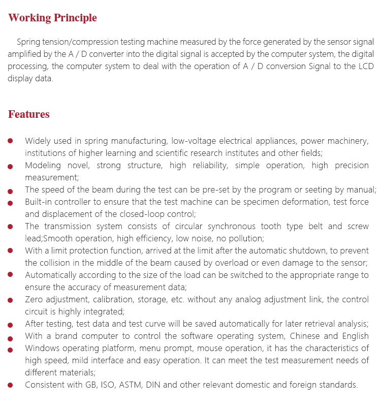 Spring tension/compression testing machine measured by the force generated by the sensor signal amplified by the A / D converter into the digital signal is accepted by the computer system, the digital processing, the computer system to deal with the operation of A / D conversion Signal to the LCD display data.