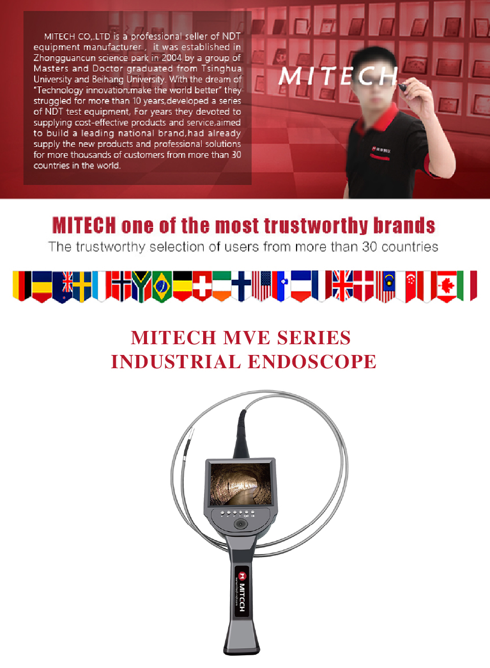 MITECH MVE Electric four directions series of industrial endoscope, based on the CMOS image sensor principle, can realize image shooting in the pipe or narrow area which can not be directly observed. And the results can be displayed with high-definition ,so as to achieve non-destructive testing. MITECH MVE series endoscope is a high-precision video electronics industry endoscope, the use of color LCD display and highly integrated CMOS image sensor to ensure that the video endoscopic image of the clear, realistic; its low power consumption, quick signal transmission speed , and easy to carry,operate. It can detect pipe or narrow spaces without tearing apart or damaging machine while not working.Cracks, welds, foreign body, wear and internal processing of parts and other circumstances can be detected with high quality images. It is widely used in aerospace, petrochemical, mechanical casting, national defense military, power production, automobile transportation and other fields, and is the important detection and monitoring equipment of industrial equipment testing and maintenance and other aspects.