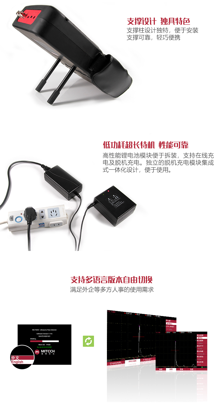產(chǎn)品概述MUT550B數(shù)字式超聲波探傷儀依據(jù)超聲傳播原理,可精準、靈敏地進行工件內(nèi)部多種缺陷(裂紋、夾雜、氣孔等)的檢測、定位、評估和診斷。采用全數(shù)字TFT640×480真彩色液晶顯示屏,在光線昏暗及日光強烈環(huán)境下都能為您呈現(xiàn)清晰缺陷;0-9999mm大量程可滿足制造業(yè)、鋼鐵冶金業(yè)、金屬加工業(yè)、化工業(yè)等常規(guī)的缺陷檢測需求;低功耗設計配備大容量高性能鋰離子電池模塊可連續(xù)工作10小時以上;全中文主從式菜單,注重用戶體驗,集快捷按鍵、數(shù)碼飛梭旋輪、十字菜單三種操作方式于一體,不同使用習慣均可操作自如;設有綜合性能指標自檢功能,可自動生成測試報告,支持多語言。該產(chǎn)品具有很高的性價比,是實用經(jīng)濟款超聲檢測儀器的明智之選。