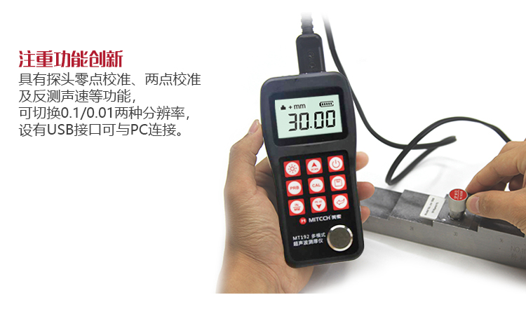 產(chǎn)品概述美泰MT192超聲波測厚儀,基于超聲波測量原理,可對金屬、塑料、陶瓷、玻璃及其他多種超聲波的良導(dǎo)體材料進(jìn)行厚度測量,也可實現(xiàn)對材料聲速的反測。與傳統(tǒng)的測量方法相比,超聲波測厚儀的優(yōu)勢在于它只要接觸到被測工件的一面即可完成測量,其獨特的可穿透涂層測厚度的性能為表面涂有油漆或防腐材料的工件厚度檢測提供了更加高效的解決方案,測量前無需處理掉表面的涂層,可以直接測量。被廣泛應(yīng)用于石油、化工、冶金、造船、航空、航天等領(lǐng)域的生產(chǎn)設(shè)備中各種管道及壓力容器腐蝕減薄程度的監(jiān)測,也可用于對各種板材及各種加工零件做精確的測量。是提高生產(chǎn)效率與合格率、節(jié)約成本必備的專業(yè)精密儀器。