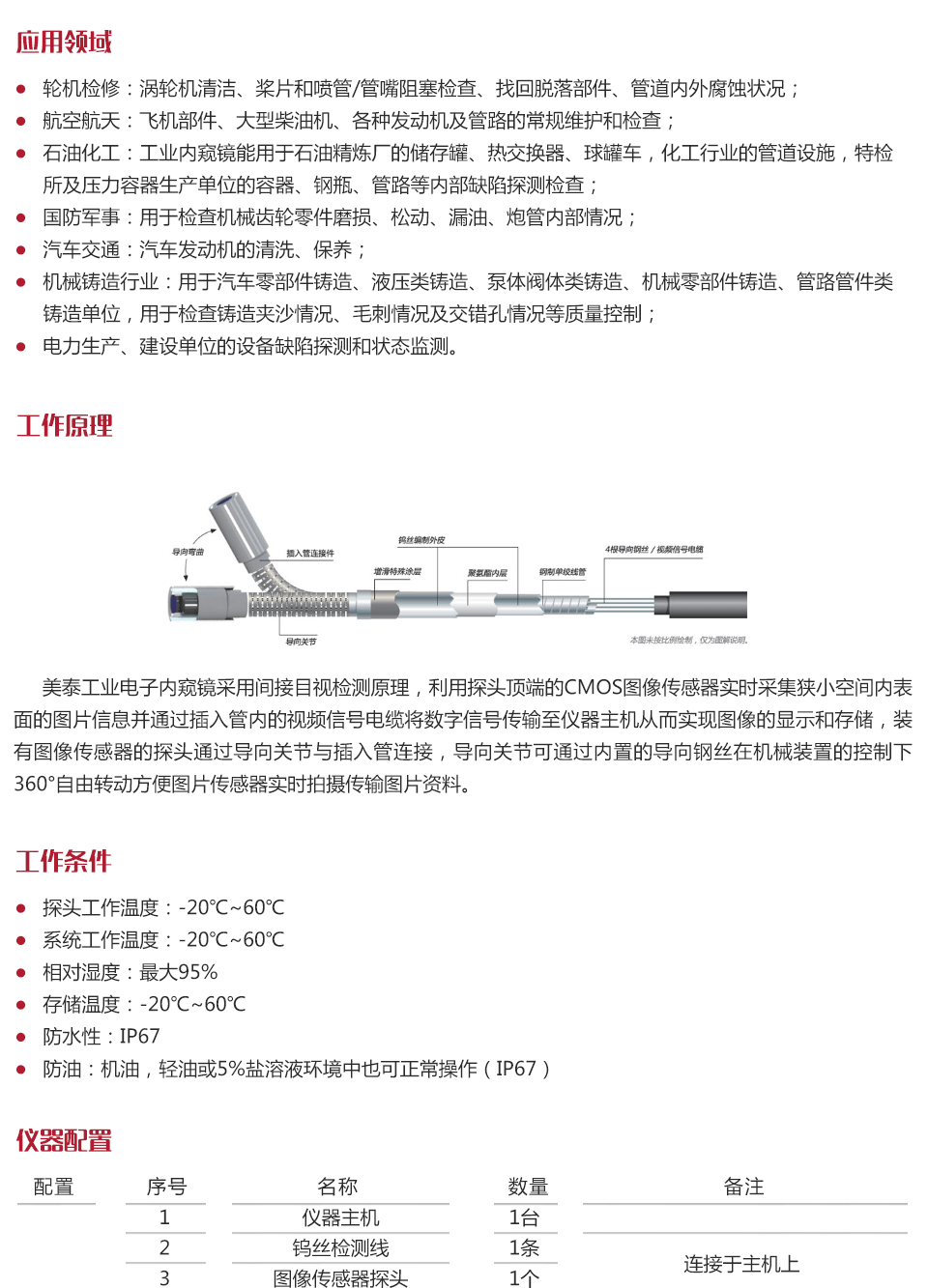 美泰工業(yè)電子內(nèi)窺鏡采用間接目視檢測(cè)原理,利用探頭頂端的CMOS圖像傳感器實(shí)時(shí)采集狹小空間內(nèi)表面的圖片信息并通過(guò)插入管內(nèi)的視頻信號(hào)電纜將數(shù)字信號(hào)傳輸至儀器主機(jī)從而實(shí)現(xiàn)圖像的顯示和存儲(chǔ),裝有圖像傳感器的探頭通過(guò)導(dǎo)向關(guān)節(jié)與插入管連接,導(dǎo)向關(guān)節(jié)可通過(guò)內(nèi)置的導(dǎo)向鋼絲在機(jī)械裝置的控制下360°自由轉(zhuǎn)動(dòng)方便圖片傳感器實(shí)時(shí)拍攝傳輸圖片資料。