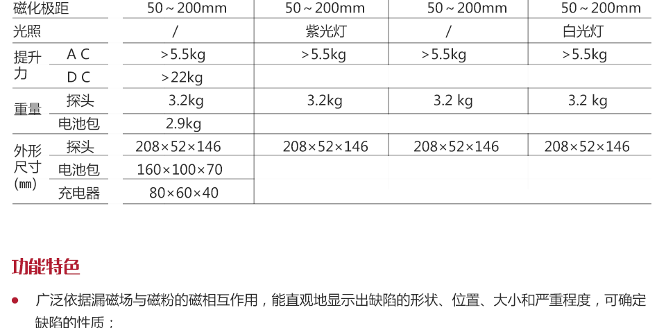 ? 白光配置的CJE220D可進(jìn)行普通磁粉探傷,紫光配置的CDX220可進(jìn)行紫光磁粉探傷,磁軛間距可調(diào)節(jié),一體化設(shè)計結(jié)構(gòu)緊湊、布局合理、體積小巧、方便攜帶,可滿足不同用戶的不同需求;
